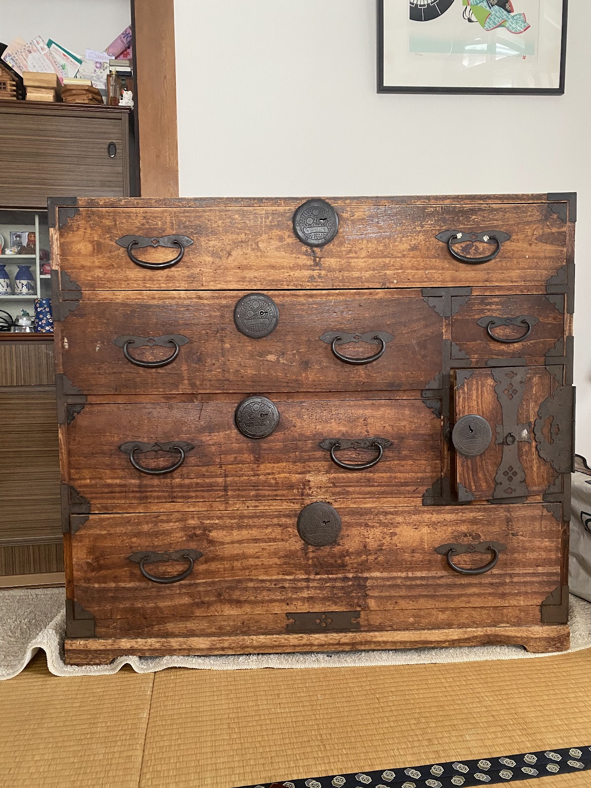 当初はこの箪笥を処分しようかと考えたそうですが、おばあちゃんのご実家で今も親交のある「渡辺家」の家紋がご依頼者様の考えを改めるものとなったと伺いました。